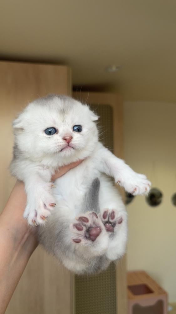 النوع المعروض هنا هو سكوتش فولد سلفر، ويُعد من الألوان الفاخرة المطلوبة بكثرة لعشاق القطط.